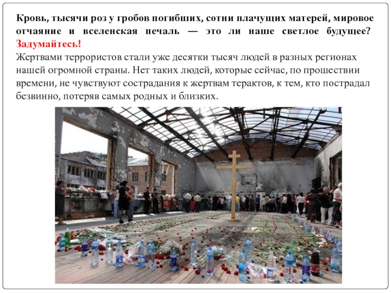 Слайд 7Кровь, тысячи роз у гробов погибших, сотни плачущих матерей, мировое отчаяние