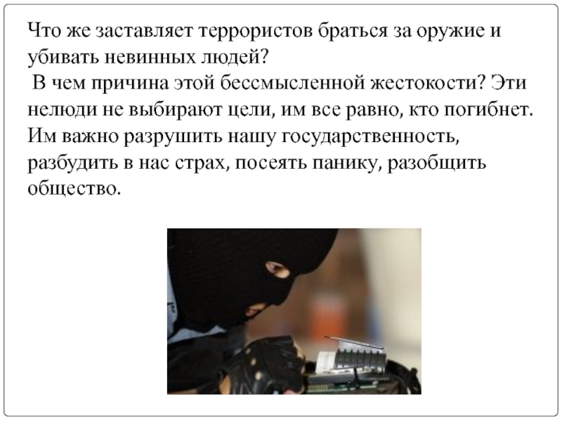 Слайд 9Что же заставляет террористов браться за оружие и убивать невинных людей?