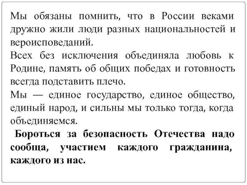 Бороться за безопасность Отечества надо сообща, участием каждого гражданина, каждого из нас.