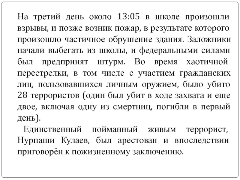 Слайд 5На третий день около 13:05 в школе произошли взрывы, и позже