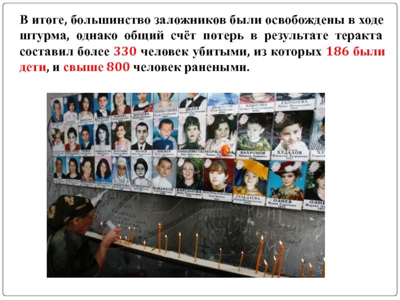 Слайд 6В итоге, большинство заложников были освобождены в ходе штурма, однако общий