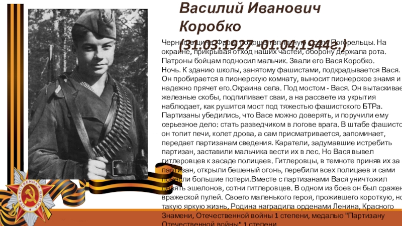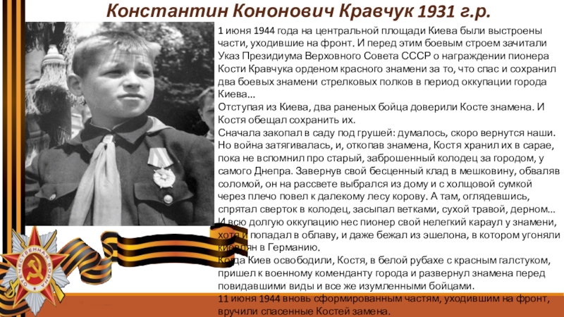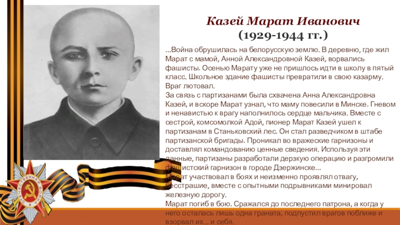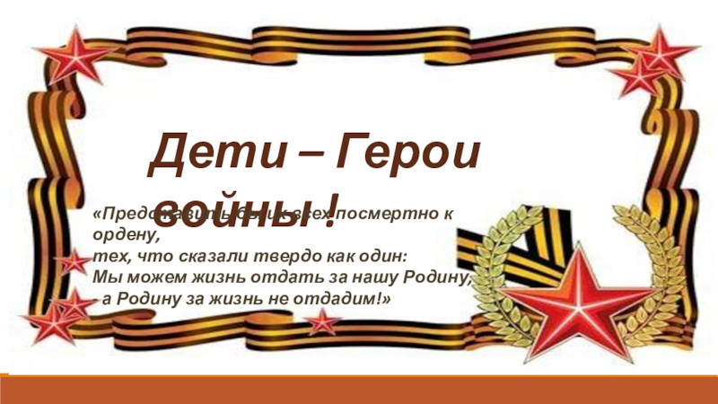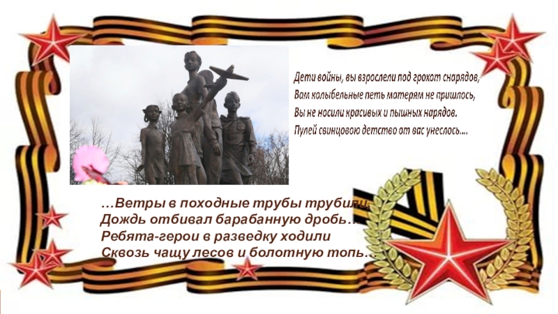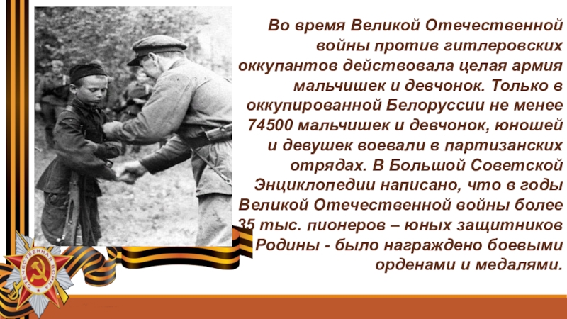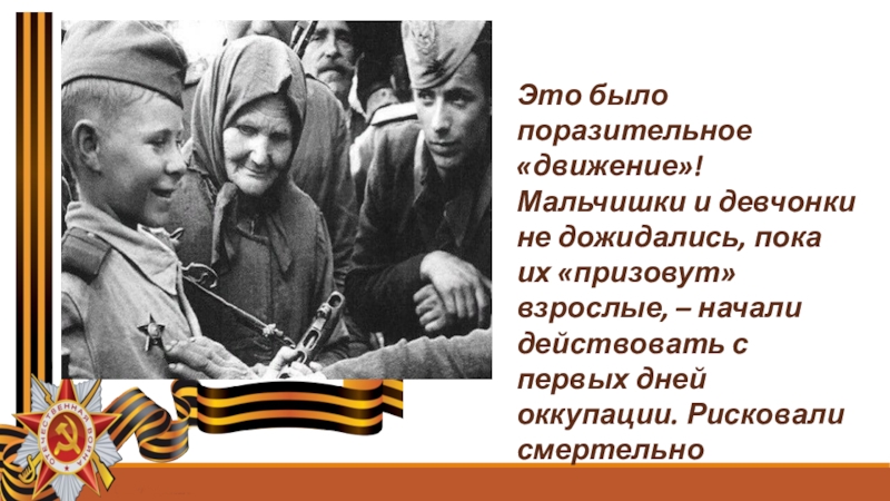 ПРИШЕЛ ЧАС - ОНИ ПОКАЗАЛИ, КАКИМ ОГРОМНЫМ МОЖЕТ СТАТЬ МАЛЕНЬКОЕ ДЕТСКОЕ СЕДЦЕ, КОГДА РАЗГОРАЕТСЯ В НЕМ СВЯЩЕННАЯ ЛЮБОВЬ К РОДИНЕ И НЕНАВИСТЬ К ЕЕ ВРАГАМ. Мальчишки. Девчонки. На их хрупкие плечи легла тяжесть невзгод, бедствий, горя военных лет. И не согнулись они под этой тяжестью, стали сильнее духом, мужественнее, выносливее.