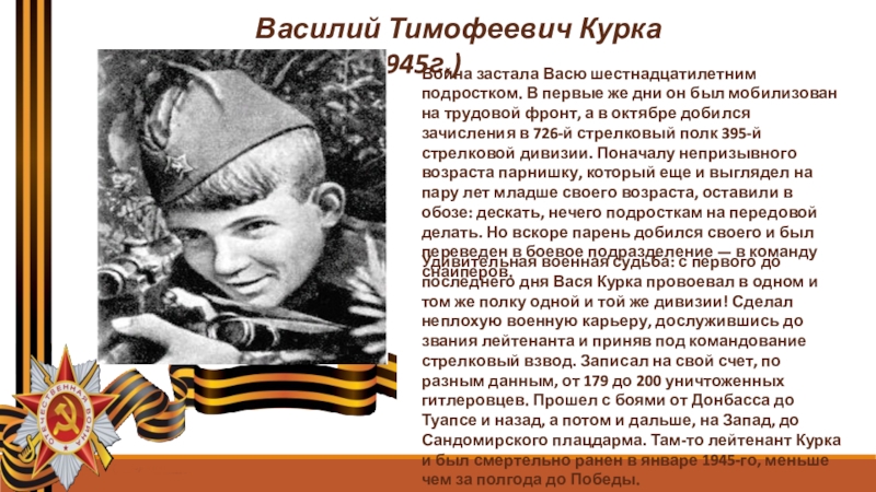 Удивительная военная судьба: с первого до последнего дня Вася Курка провоевал в одном и том же полку одной и той же дивизии! Сделал неплохую военную карьеру, дослужившись до звания лейтенанта и приняв под командование стрелковый взвод. Записал на свой счет, по разным данным, от 179 до 200 уничтоженных гитлеровцев. Прошел с боями от Донбасса до Туапсе и назад, а потом и дальше, на Запад, до Сандомирского плацдарма. Там-то лейтенант Курка и был смертельно ранен в январе 1945-го, меньше чем за полгода до Победы.