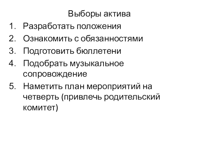 Выборы активаРазработать положенияОзнакомить с обязанностямиПодготовить бюллетениПодобрать музыкальное сопровождениеНаметить план мероприятий на четверть (привлечь родительский комитет)