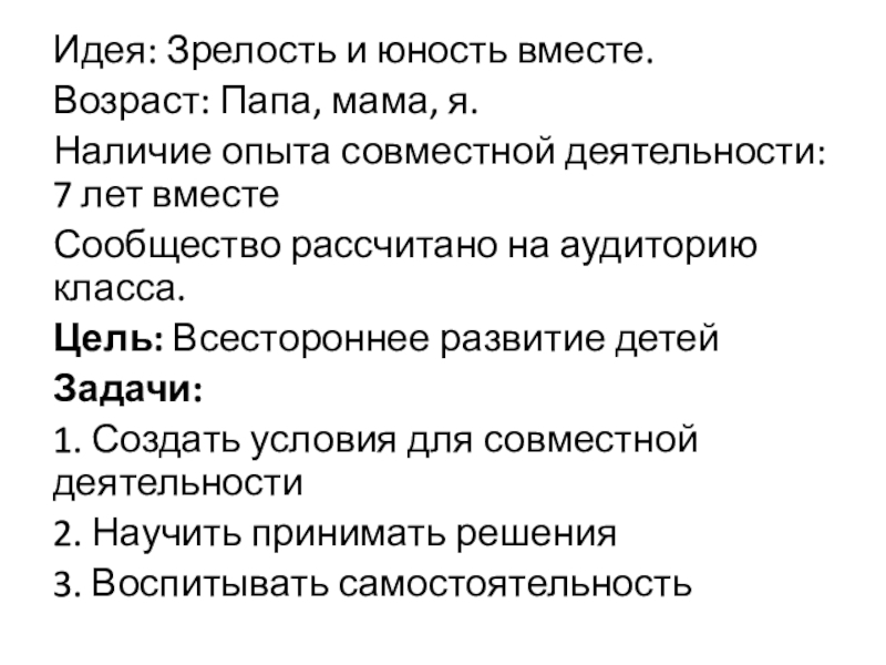 Идея: Зрелость и юность вместе. Возраст: Папа, мама, я.Наличие опыта совместной деятельности: 7 лет вместеСообщество рассчитано на аудиторию класса.Цель: Всестороннее развитие детейЗадачи: 1. Создать условия для совместной деятельности2. Научить принимать решения3. Воспитывать самостоятельность