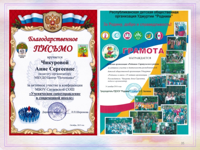 Благодарственное письмо МБОУ Сигаевская СОШ за активное участие в школьной конференции на тему «Ученическое самоуправление в современной школе» (2015г.);