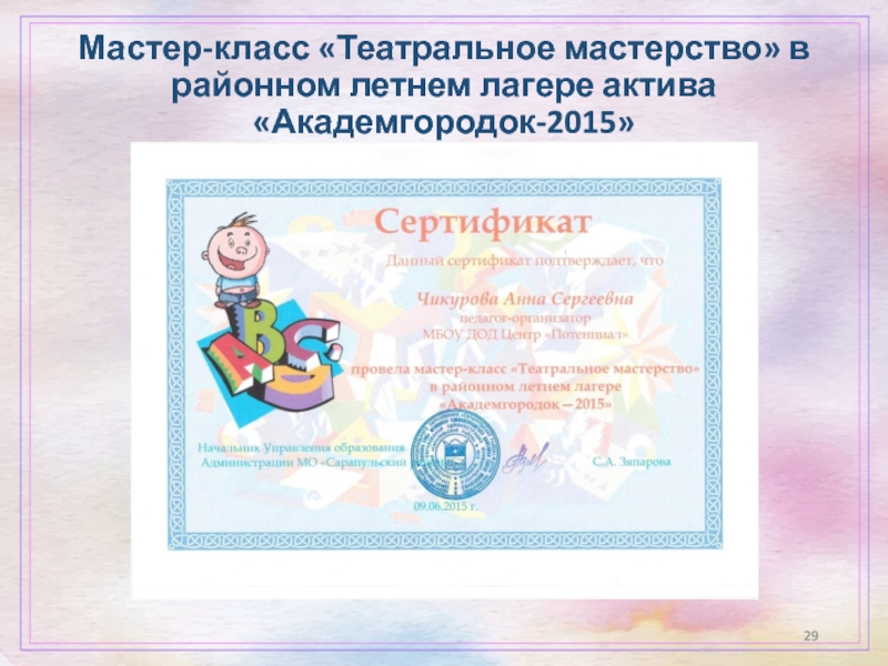 Слайд 29Мастер-класс «Театральное мастерство» в районном летнем лагере актива