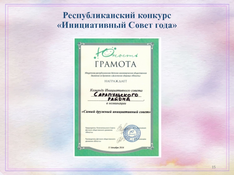 Грамота Удмуртского республиканского детского некоммерческого общественного движения за