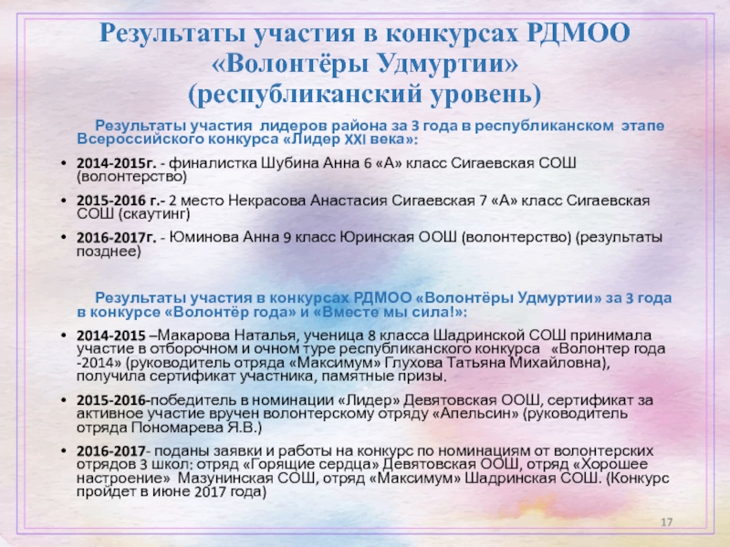 Слайд 17Результаты участия в конкурсах РДМОО «Волонтёры Удмуртии»
