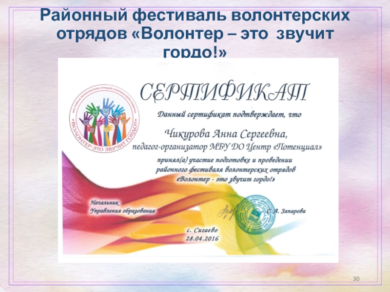 Слайд 30Районный фестиваль волонтерских отрядов «Волонтер – это звучит гордо!»