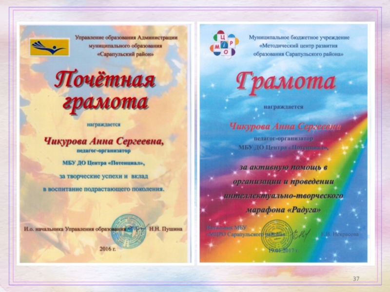 Грамота МБУ «Методический центр развития образования Сарапульского района» за активную помощь в организации и проведении интеллектуального-творческого марафона «Радуга» (2017 г.)