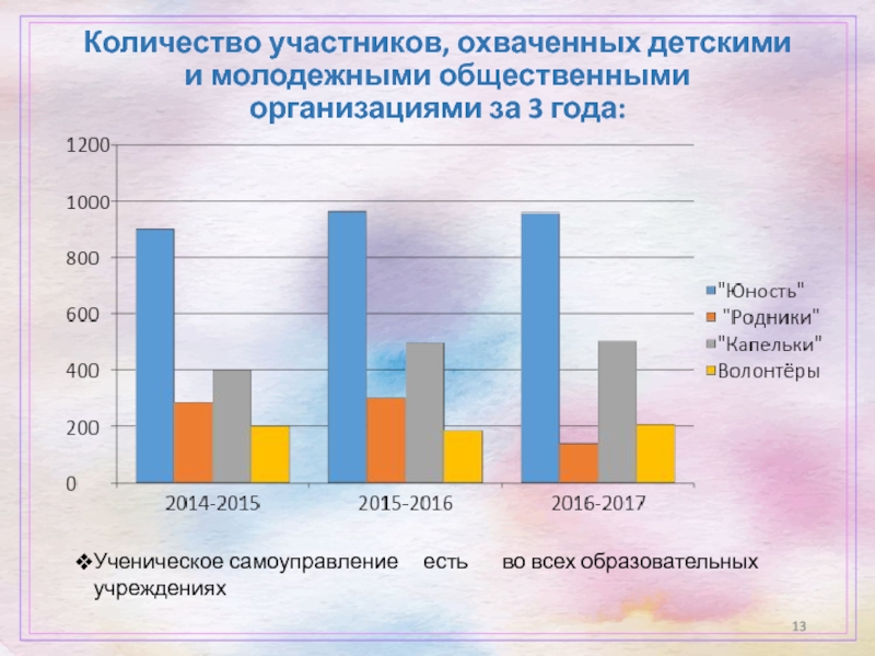 Слайд 13Количество участников, охваченных детскими и молодежными общественными организациями за 3 года: