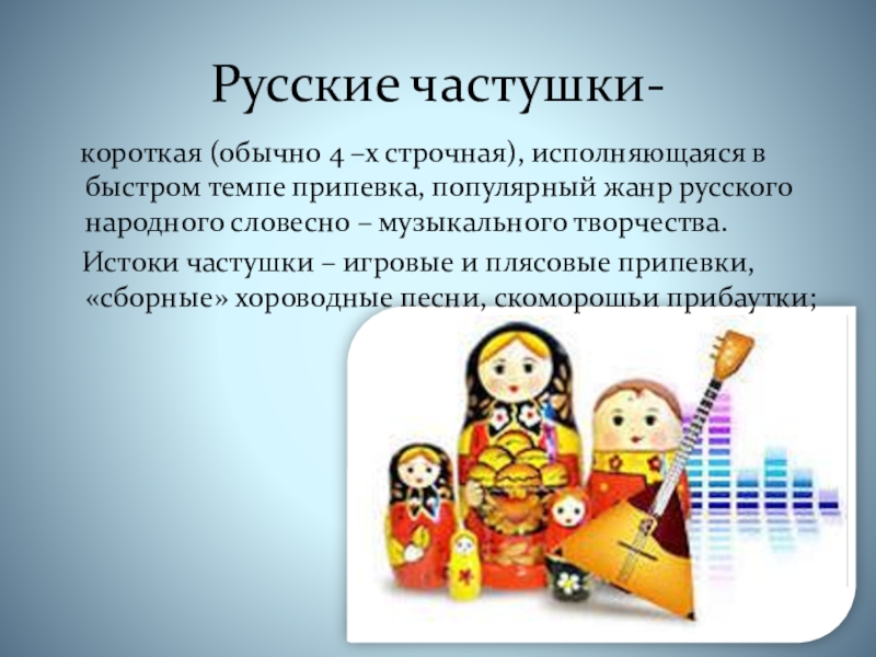 Русские частушки-  короткая (обычно 4 –х строчная), исполняющаяся в быстром темпе припевка, популярный жанр русского народного