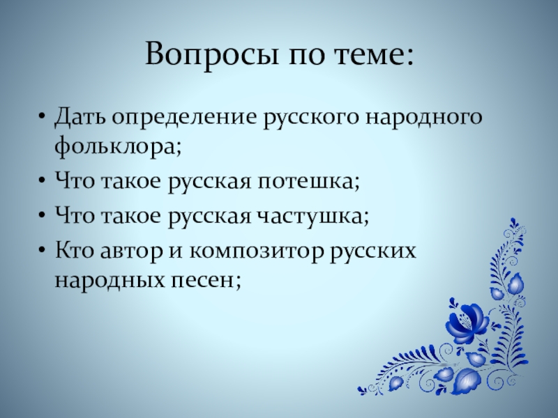 Вопросы по теме:Дать определение русского народного фольклора;Что такое русская потешка;Что такое русская частушка;Кто автор и композитор русских
