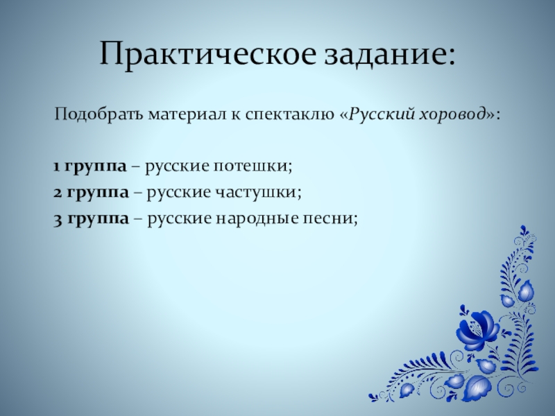 Практическое задание:  Подобрать материал к спектаклю «Русский хоровод»:  1 группа – русские потешки;  2