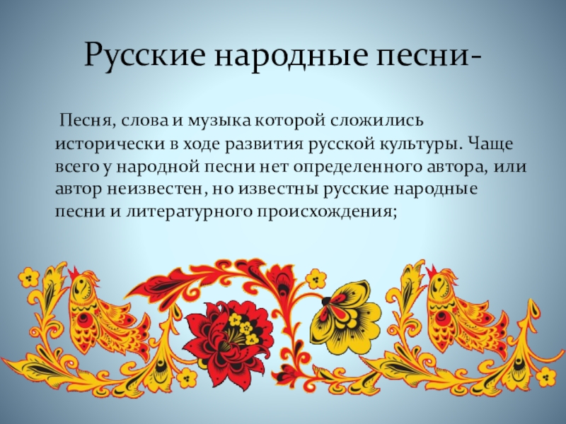Русские народные песни-  Песня, слова и музыка которой сложились исторически в ходе развития русской культуры. Чаще