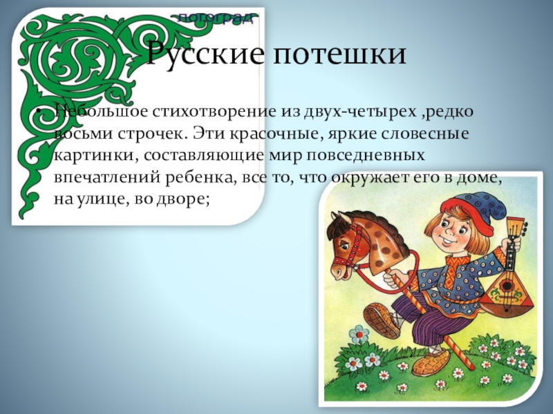Русские потешкиНебольшое стихотворение из двух-четырех ,редко восьми строчек. Эти красочные, яркие словесные картинки, составляющие мир повседневных впечатлений