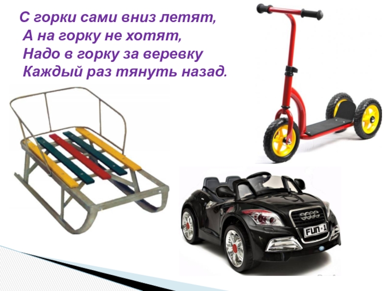 С горки сами вниз летят, А на горку не хотят, Надо в горку за веревку Каждый раз