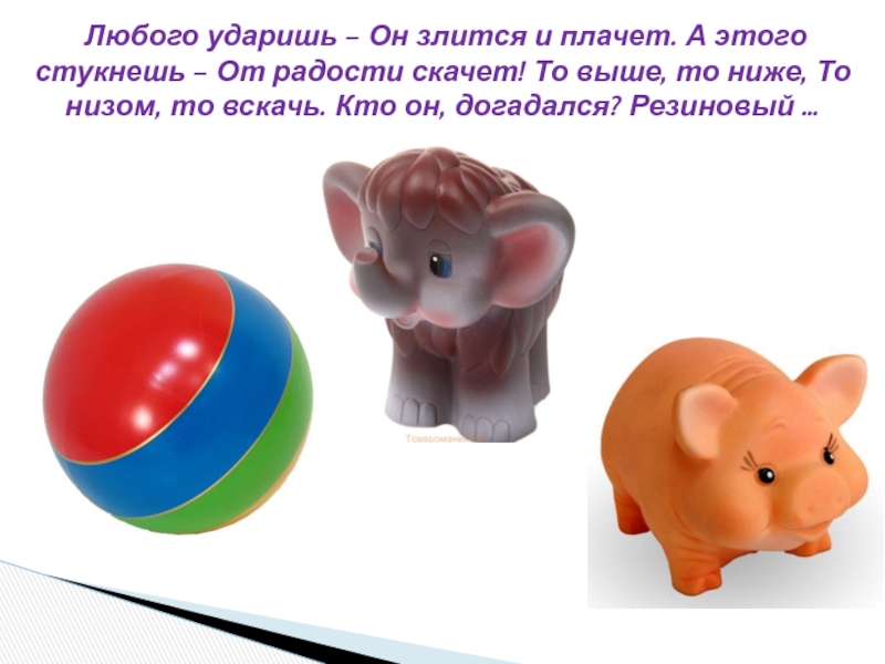 Любого ударишь – Он злится и плачет. А этого стукнешь – От радости скачет! То выше, то ниже, То низом, то вскачь. Кто он, догадался? Резиновый …