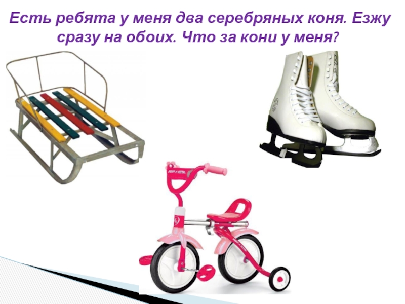 Слайд 5 Есть ребята у меня два серебряных коня. Езжу сразу на