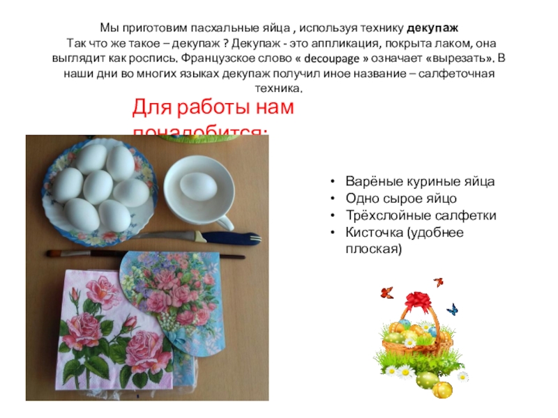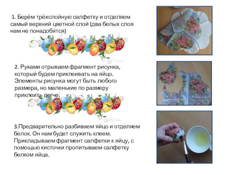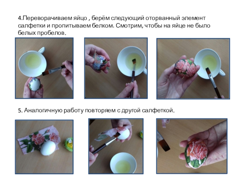 3.Предварительно разбиваем яйцо и отделяем белок. Он нам будет служить клеем. Прикладываем фрагмент салфетки к яйцу, с помощью кисточки пропитываем салфетку белком яйца.
