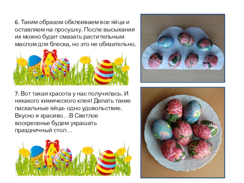 7. Вот такая красота у нас получилась. И никакого химического клея! Делать такие пасхальные яйца- одно удовольствие. Вкусно и красиво…В Светлое воскресенье будем украшать праздничный стол…