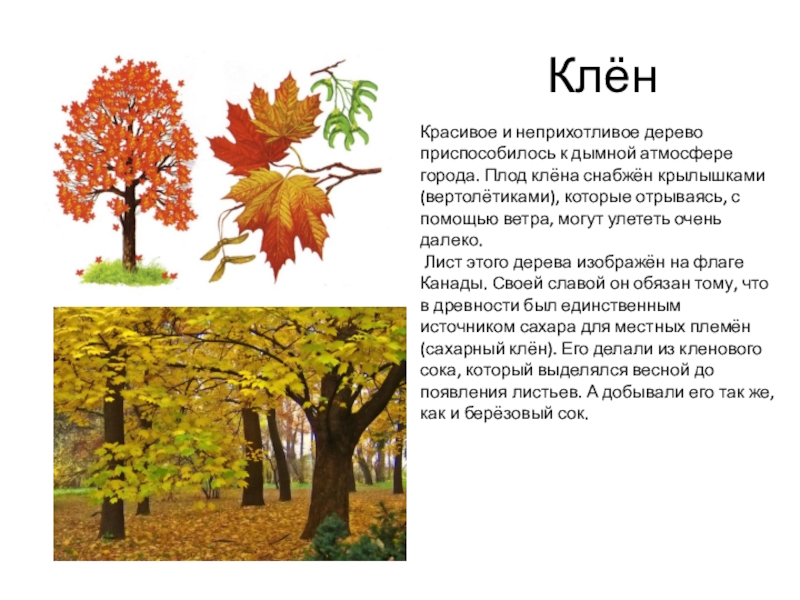 Красивое и неприхотливое дерево приспособилось к дымной атмосфере города. Плод клёна