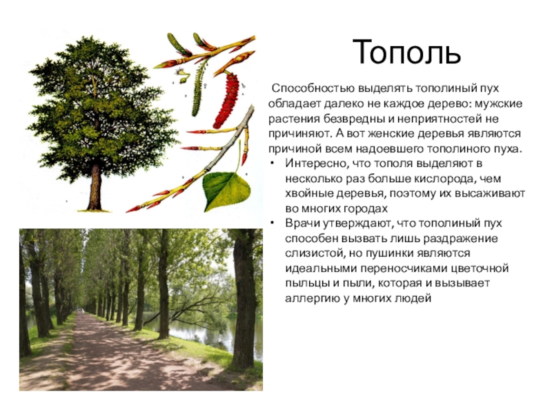 растения безвредны и неприятностей не причиняют. А вот женские деревья являются причиной всем надоевшего тополиного пуха.