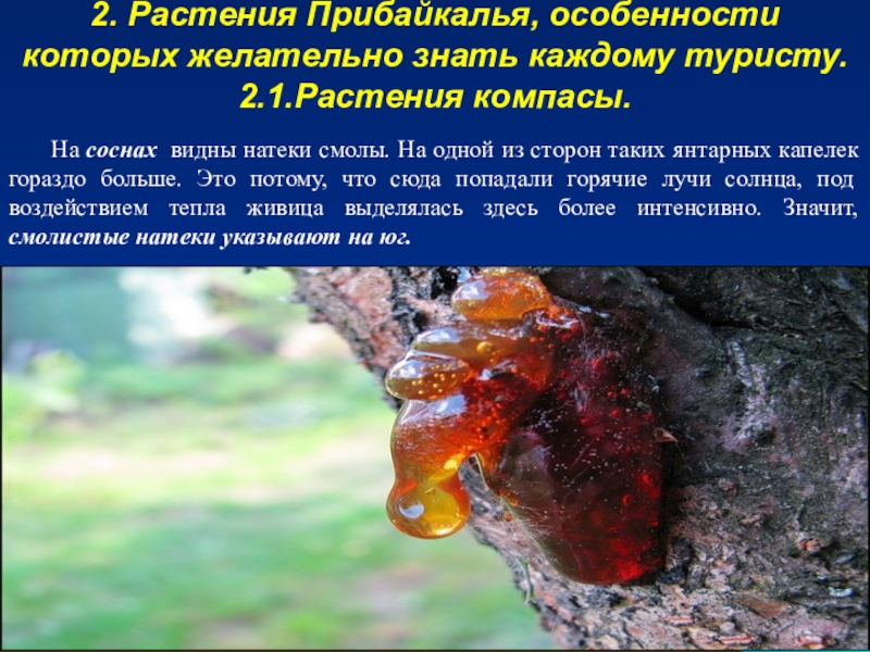 видны натеки смолы. На одной из сторон таких янтарных капелек гораздо больше. Это потому, что сюда попадали горячие лучи солнца, под воздействием тепла живица выделялась здесь более интенсивно. Значит, смолистые натеки указывают на юг.