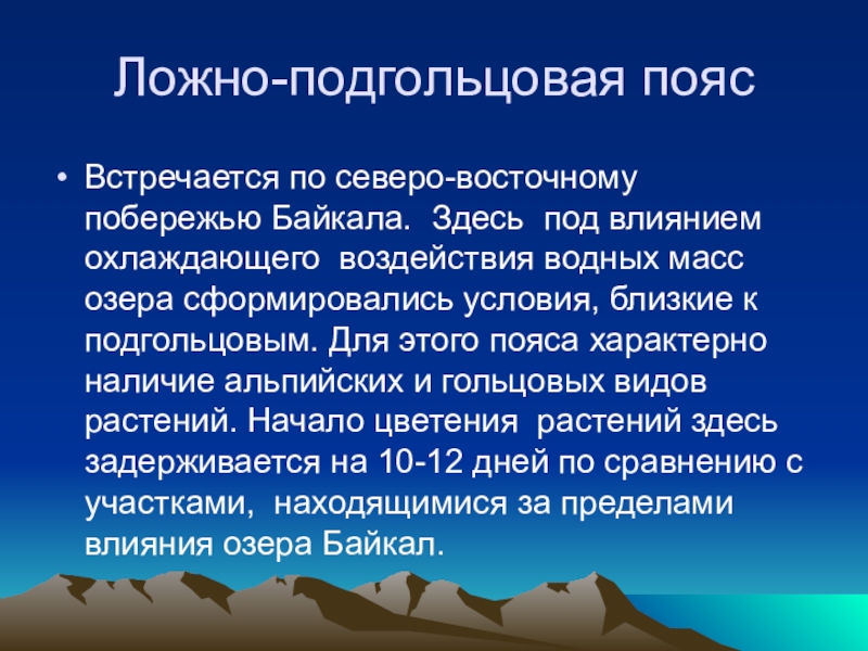 водных масс озера сформировались условия, близкие к подгольцовым. Для этого пояса характерно наличие альпийских и гольцовых видов растений. Начало цветения растений здесь задерживается на 10-12 дней по сравнению с участками, находящимися за пределами влияния озера Байкал.
