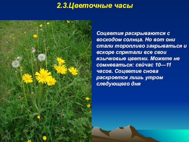 Слайд 36Корзинки мать-и-мачехи, состоящие из множества цветков, раскрываются в 9— 10 часов,