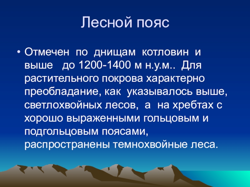 м н.у.м.. Для растительного покрова характерно преобладание, как указывалось выше, светлохвойных лесов, а на хребтах с хорошо выраженными гольцовым и подгольцовым поясами, распространены темнохвойные леса.