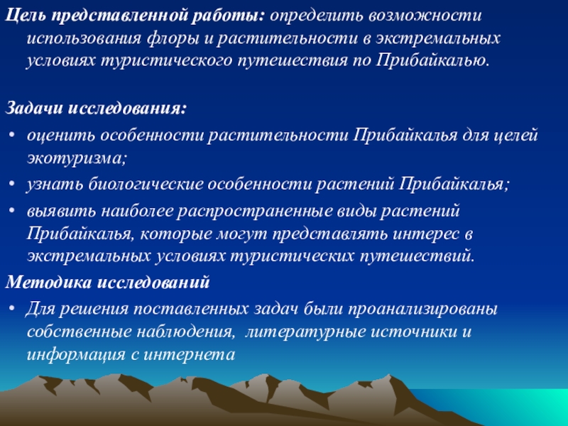 Слайд 3Цель представленной работы: определить возможности использования флоры и растительности в экстремальных