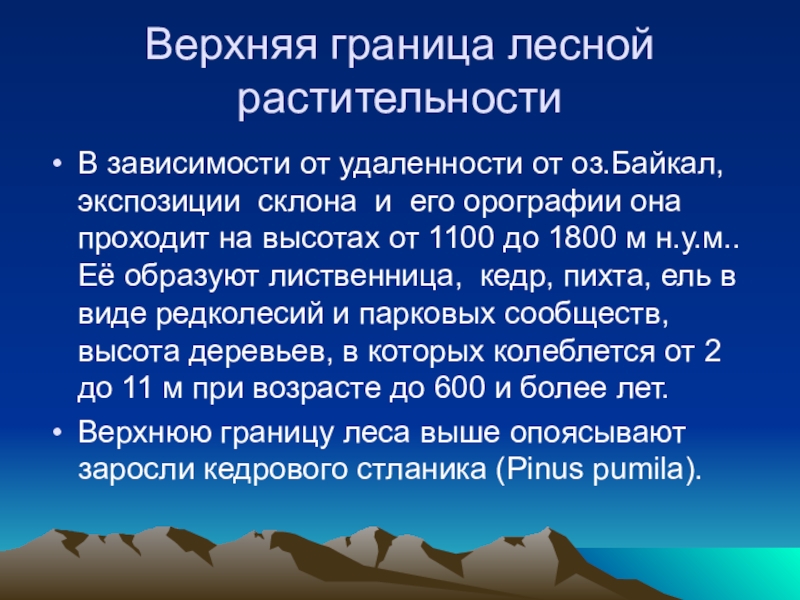 Верхнюю границу леса выше опоясывают заросли кедрового стланика (Pinus pumila).