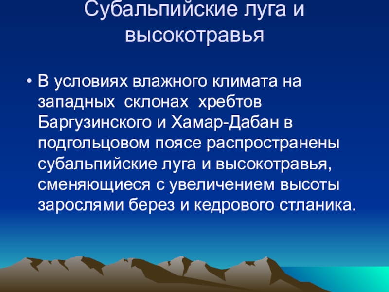 хребтов Баргузинского и Хамар-Дабан в подгольцовом поясе распространены субальпийские луга и высокотравья, сменяющиеся с увеличением высоты зарослями берез и кедрового стланика.