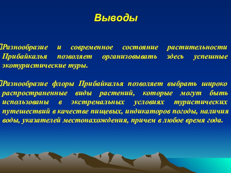Разнообразие флоры Прибайкалья позволяет выбрать широко распространенные виды растений, которые могут быть использованы в экстремальных условиях туристических путешествий в качестве пищевых, индикаторов погоды, наличия воды, указателей местонахождения, причем в любое время года.