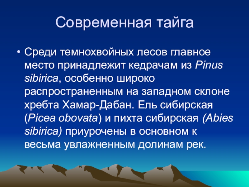 особенно широко распространенным на западном склоне хребта Хамар-Дабан. Ель сибирская (Picea obovata) и пихта сибирская (Abies sibirica) приурочены в основном к весьма увлажненным долинам рек.
