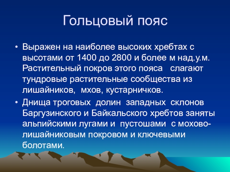 растительности: лесной, подгольцовый (субальпийский) и гольцовый (альпийский). Кроме этого, на восточных склонах Баргузинского и южных отрогах Байкальского и Приморского хребтов, на о.Ольхон представлен лесостепной пояс и степи.