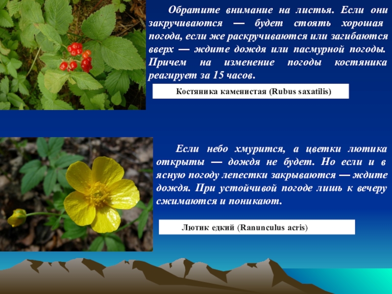погода, если же раскручиваются или загибаются вверх — ждите дождя или пасмурной погоды. Причем на изменение погоды костяника реагирует за 15 часов.