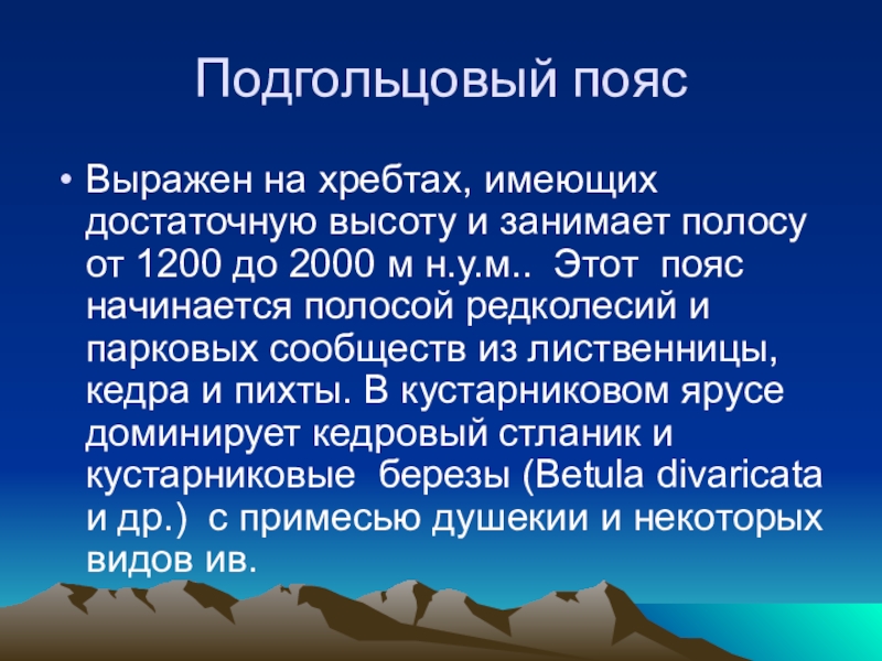 1200 до 2000 м н.у.м.. Этот пояс начинается полосой редколесий и парковых сообществ из лиственницы, кедра и пихты. В кустарниковом ярусе доминирует кедровый стланик и кустарниковые березы (Вetula divaricata и др.) с примесью душекии и некоторых видов ив.
