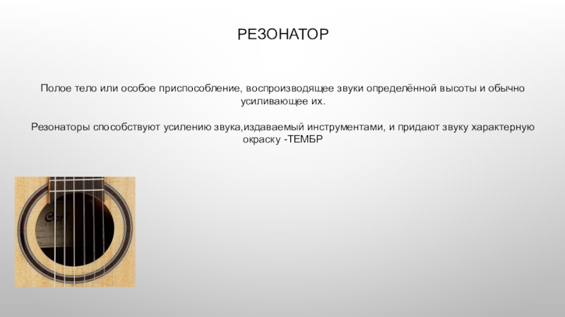 РЕЗОНАТОР Полое тело или особое приспособление, воспроизводящее звуки определённой высоты и обычно усиливающее их. Резонаторы способствуют усилению