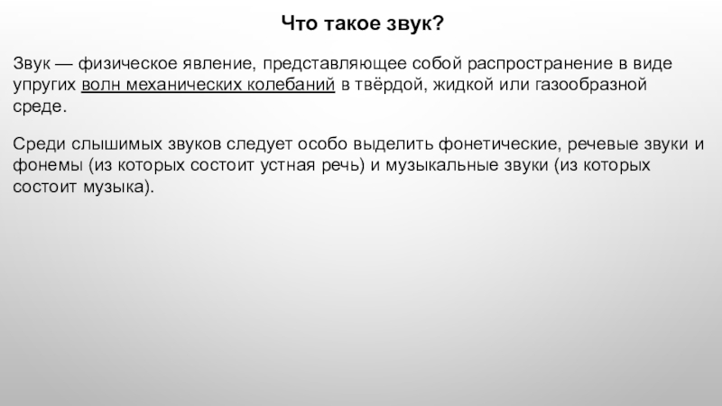 Что такое звук?Звук — физическое явление, представляющее собой распространение в виде упругих волн механических колебаний в твёрдой, жидкой или газообразной среде.Среди слышимых звуков следует особо выделить фонетические, речевые звуки и фонемы (из которых состоит устная
