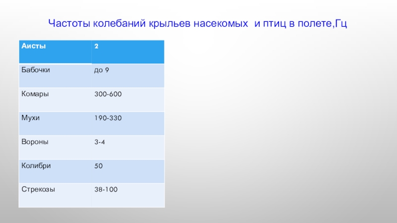 Слайд 6Частоты колебаний крыльев насекомых и птиц в полете,Гц