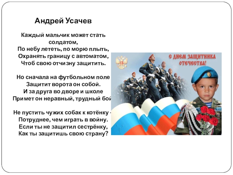 он морским офицером или программистом, бизнесменом или милиционером, ученым или фермером - Защитник. 23 февраля – это День Защитника своего Отечества, своей семьи.