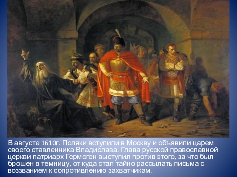 своего ставленника Владислава. Глава русской православной церкви патриарх Гермоген выступил против этого, за что был брошен в темницу, от куда стал тайно рассылать письма с воззванием к сопротивлению захватчикам.