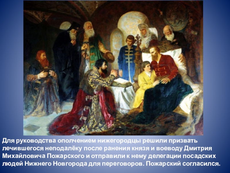 Слайд 11Для руководства ополчением нижегородцы решили призвать лечившегося неподалёку после ранения князя