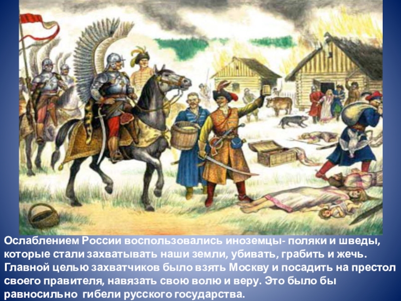 Слайд 5Ослаблением России воспользовались иноземцы- поляки и шведы, которые стали захватывать наши