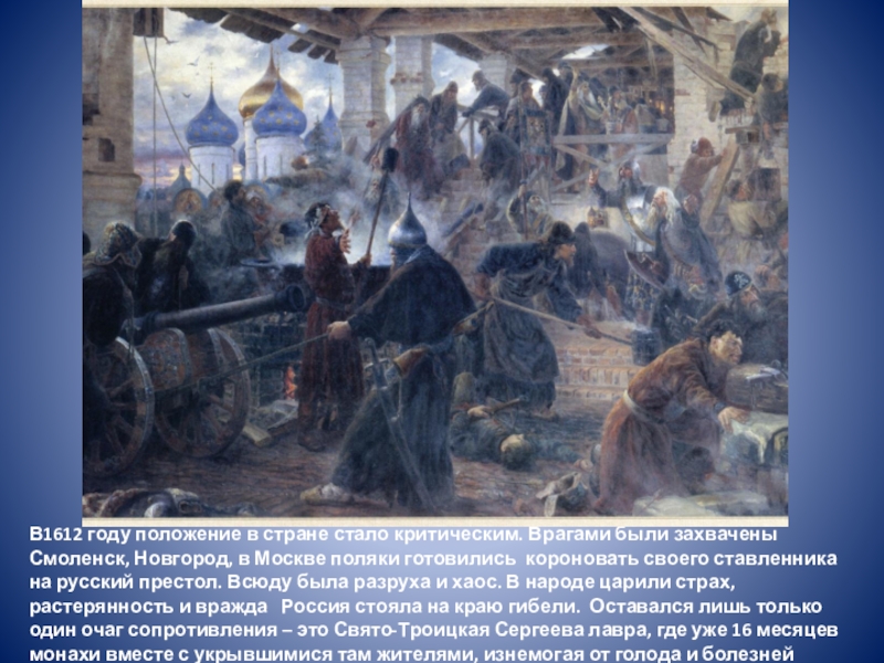 Новгород, в Москве поляки готовились короновать своего ставленника на русский престол. Всюду была разруха и хаос. В народе царили страх, растерянность и вражда Россия стояла на краю гибели. Оставался лишь только один очаг сопротивления – это Свято-Троицкая Сергеева лавра, где уже 16 месяцев монахи вместе с укрывшимися там жителями, изнемогая от голода и болезней мужественно оборонялись от завоевателей.