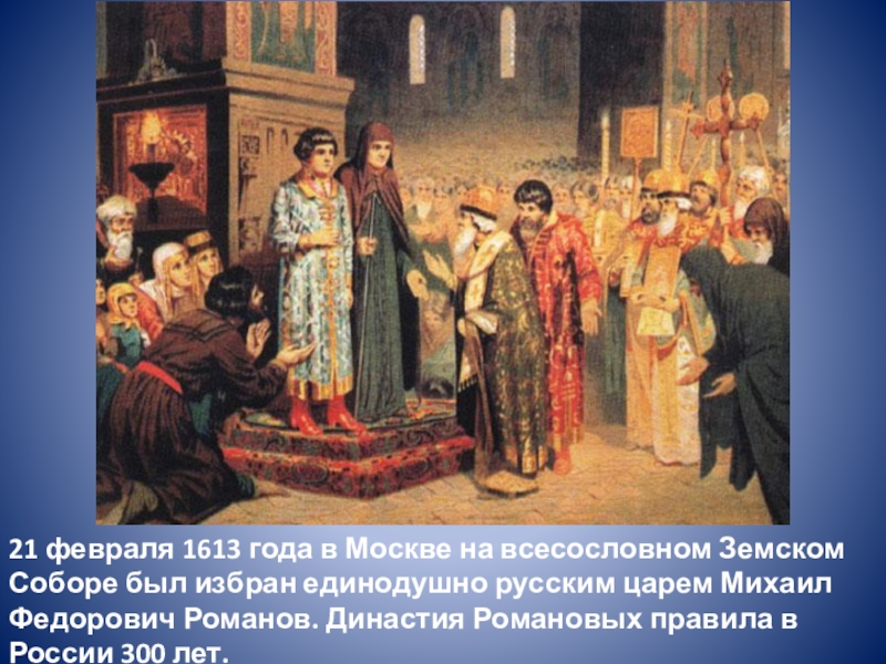 избран единодушно русским царем Михаил Федорович Романов. Династия Романовых правила в России 300 лет.