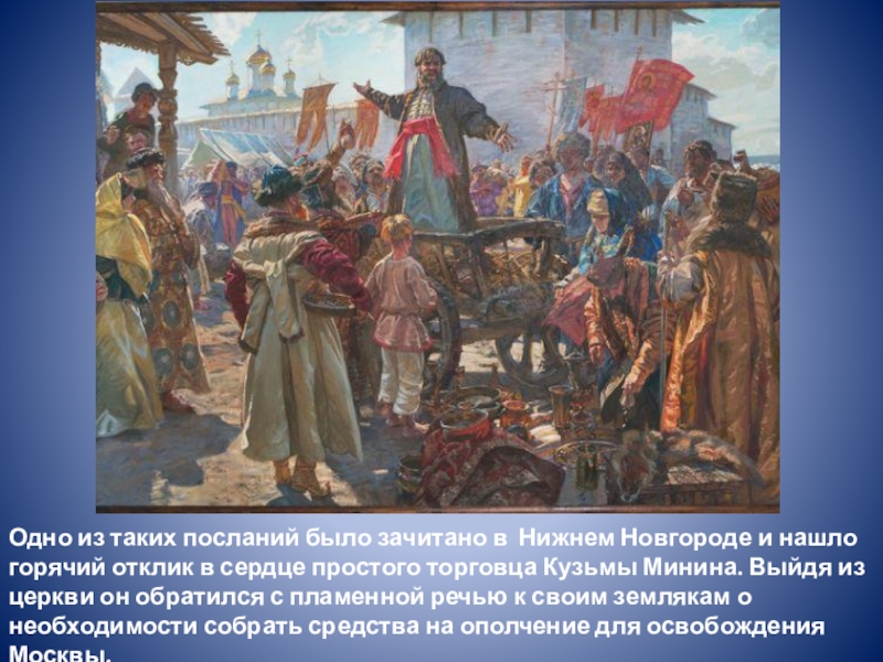 горячий отклик в сердце простого торговца Кузьмы Минина. Выйдя из церкви он обратился с пламенной речью к своим землякам о необходимости собрать средства на ополчение для освобождения Москвы.